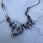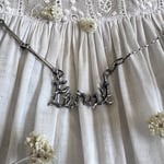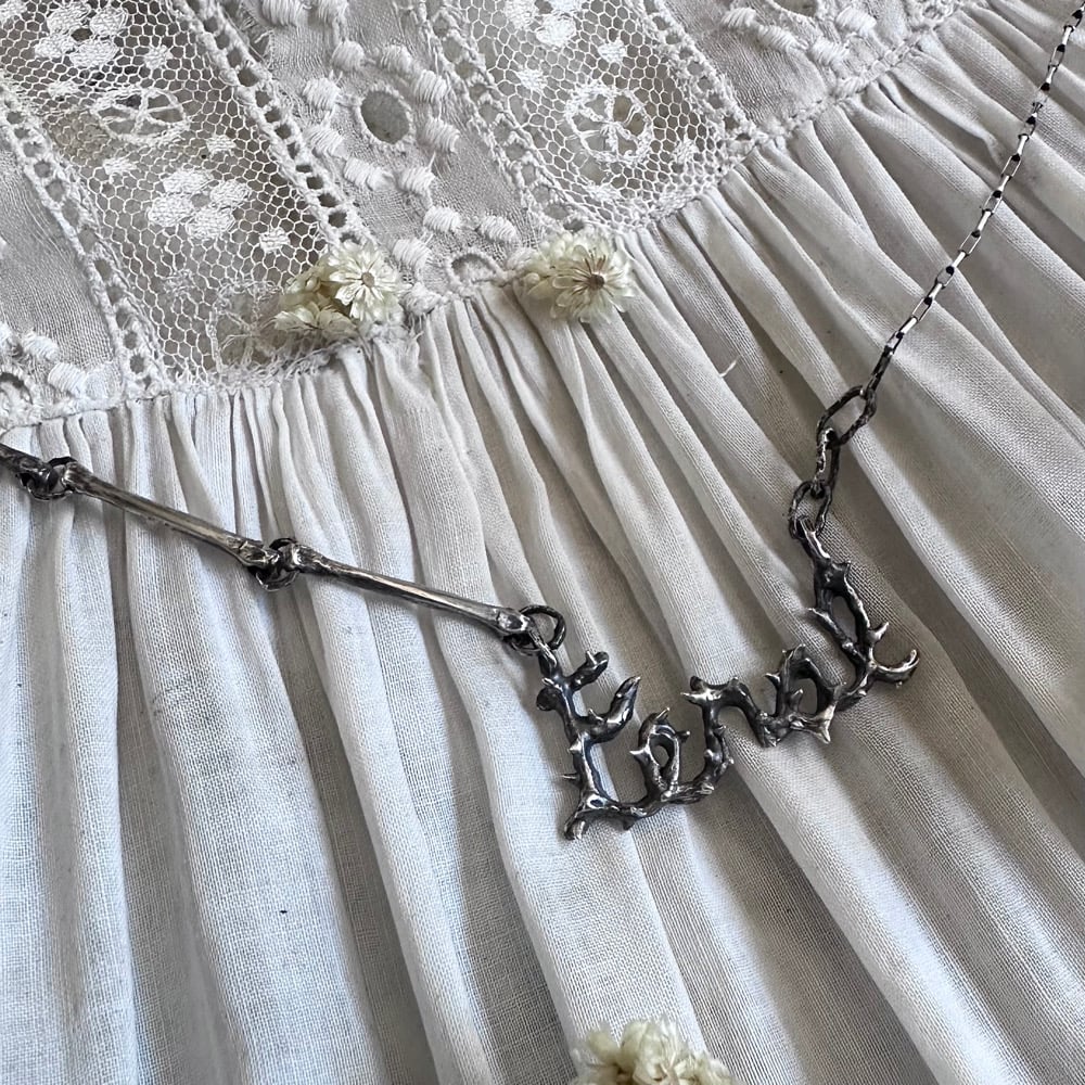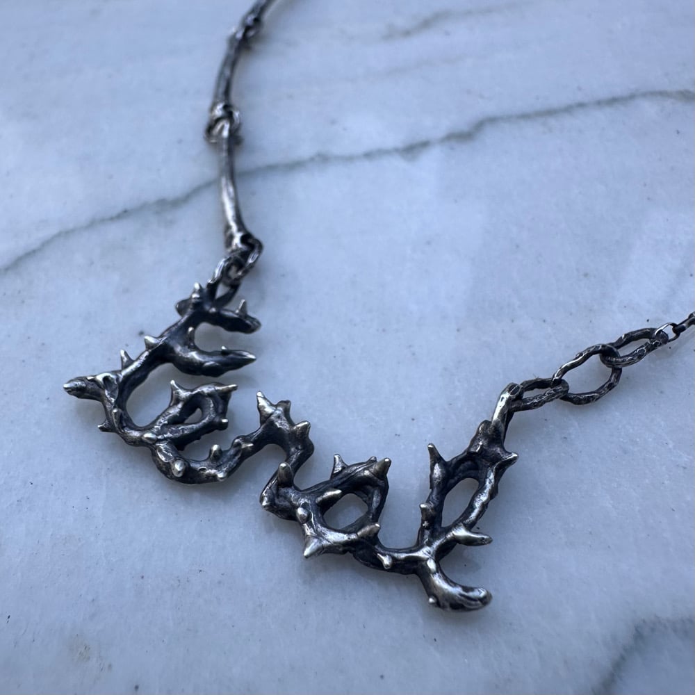 This is a truly unique, one of a kind piece. Created in sterling silver, the thorny bramble spell out feral in a cursive font.