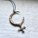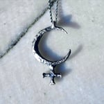 It hangs on 18” on silver chain and measures about 1 1/2 inches.