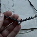 The center holds a white sapphire, set in thorn prongs. For the thorns act to protect the beauty of the rose, this piece acts as protection to the wearer. The chain is entirely handmade of silver bone links and a bone clasp. It’s an ode to Mother Nature and all her beauty and magic.