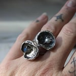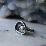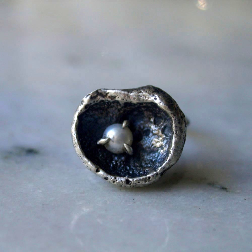 Cast from a naturally formed cupule stone, this one of a kind ring is ode to the natural beauty of nature. In the center of the silver cupule is a pearl set in a claw like setting.